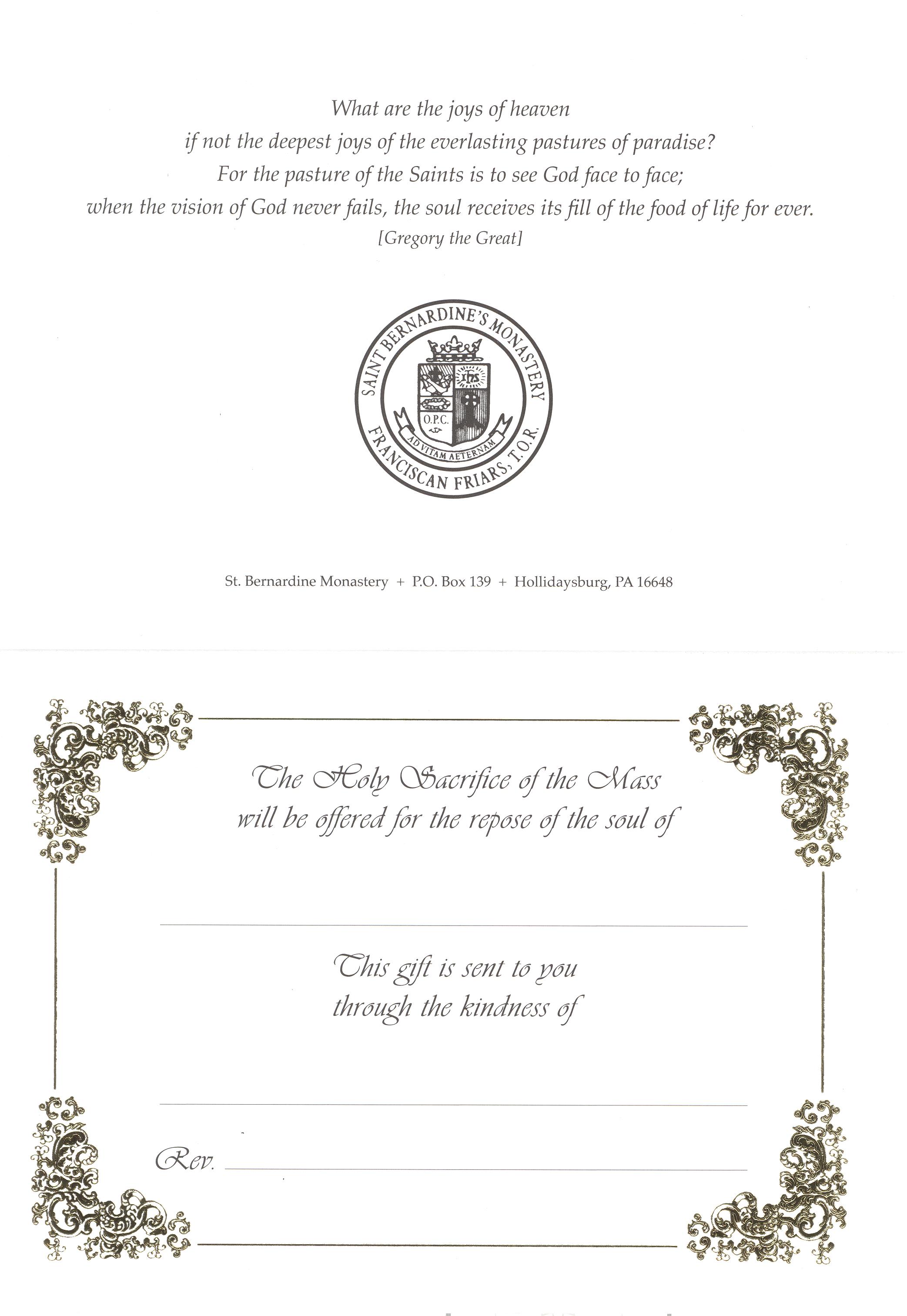 On the other side it states “The Holy Sacrifice of the Mass will be offered for the repose of the soul of ____. This gift is sent to you through the kindness of ____.”